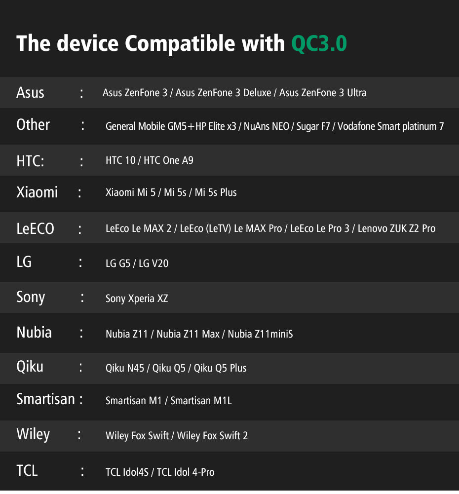 Support Quick Charge Technology: Qualcomm Quick Charge 3.0